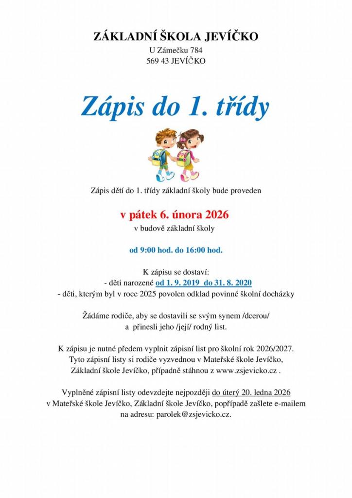 Rodiče by měli přivést děti narozené mezi 1. zářím 2019 a 31. srpnem 2020, včetně těch, kterým byl v roce 2025 povolen odklad školní docházky. K zápisu je nutné přinést rodný list dítěte a vyplněný zápisní list pro školní rok 2026/2027. Tyto zápisní listy si mohou rodiče vyzvednout v Mateřské škole nebo Základní škole Jevíčko, případně si je stáhnout z webových stránek školy. Vyplněné listy je nutné odevzdat do úterý 20. ledna 2026.