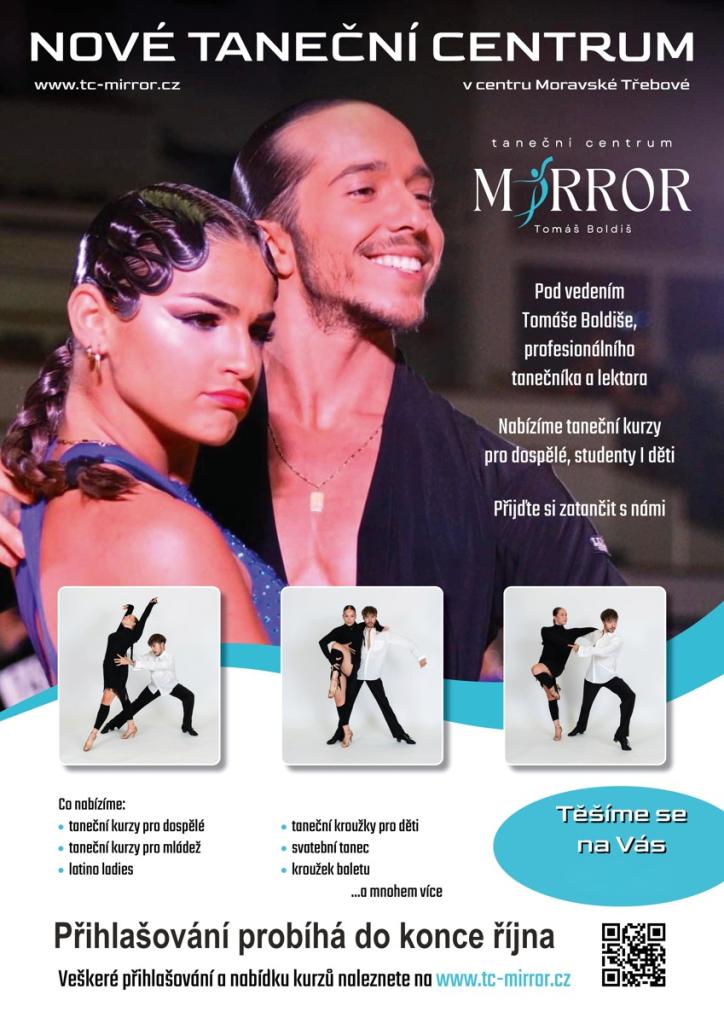 Přijďte si zatančit v novém tanečním centru MIRROR v Moravské Třebové. Pod vedením profesionálního tanečníka Tomáše Boldiše nabízíme širokou škálu tanečních kurzů pro dospělé, mládež a mladé lidi. Kromě klasických kurzů máte možnost se naučit svatební tanec či latino ladies. Nezapomeňte, že přihlašování probíhá do konce října, ať už se jedná o taneční kurzy pro dospělé nebo kroužky pro děti. Navštivte naše webové stránky pro více informací.