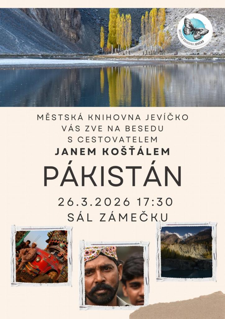 Městská knihovna Jevíčko pořádá besedu s cestovatelem Janem Košťálem, kde se zaměří na jeho zážitky z cesty po Pakistánu. Akce se uskuteční 26. března 2026 v 17:30 hodin v sále Zámečku. Tato beseda je určena pro všechny, kteří mají zájem o cestování a poznávání nových kultur. Přijďte se inspirovat a sdílet své vlastní zážitky.