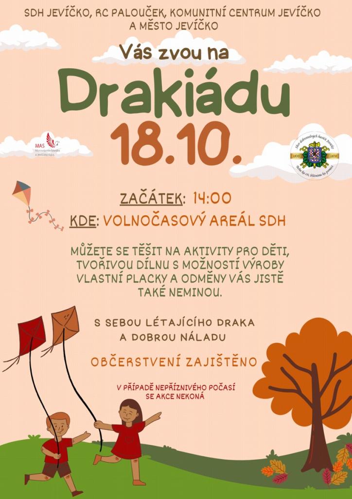 Srdečně zveme všechny děti i dospělé na tradiční Drakiádu, která se koná v pátek 18. října od 14:00 ve volnočasovém areálu SDH Jevíčko. Těšit se můžete na zábavné aktivity, tvořivou dílnu s výrobou vlastních placek a odměny pro malé účastníky. Nezapomeňte si užít občerstvení a dobrou náladu při létání draků. V případě nepříznivého počasí se akce nekoná.