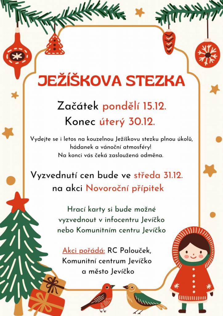Vydejte se na kouzelnou Ježíškovu stezku, která probíhá od 15. do 30. prosince. Tato akce je plná úkolů, hádanek a vánoční atmosféry, která vás vtáhne do magického světa Vánoc. Na konci stezky na vás čeká zasloužená odměna, kterou si můžete vyzvednout na akci Novoroční přípitek 31. prosince. Využijte příležitosti a zúčastněte se této jedinečné akce, která přináší radost nejen dětem, ale i celé komunitě.