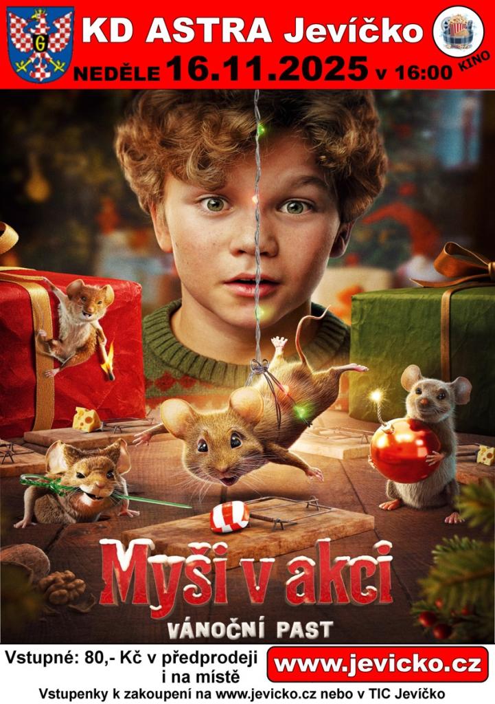 Zveme vás na dětské promítání komedie Myši v akci - vánoční past, které se koná v neděli 16. listopadu 2025 od 16 hodin v kulturním domě Astra. Mladí diváci se mohou těšit na zábavný příběh plný dobrodružství. Vstupné je 80 Kč, a to jak v předprodeji, tak i na místě. Vstupenky si můžete zakoupit na webových stránkách města Jevíčko.