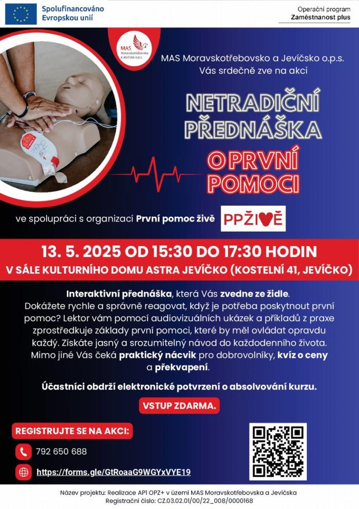 MAS Moravskotřebovsko a Jevíčsko o.p.s. ve spolupráci s organizací První pomoc živě vás zve na interaktivní přednášku o první pomoci, která proběhne 13. května 2025 od 15:30 do 17:30 hodin v kulturním domě Astra Jevíčko. Účastníci se mohou těšit na praktický nácvik, kvíz o ceny a překvapení.