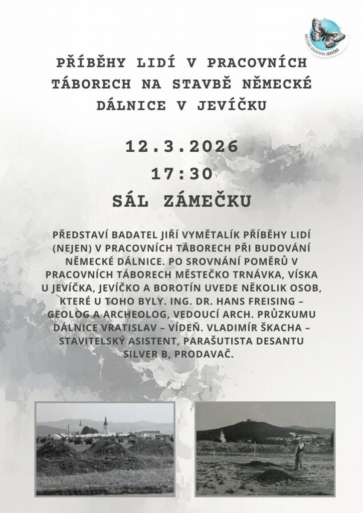 Přednáška se uskuteční 12. března 2026 v 17.30 v sále Zámečku. Badatel Jiří Vymětalík přiblíží příběhy lidí, kteří zažili život v pracovních táborech při budování německé dálnice.