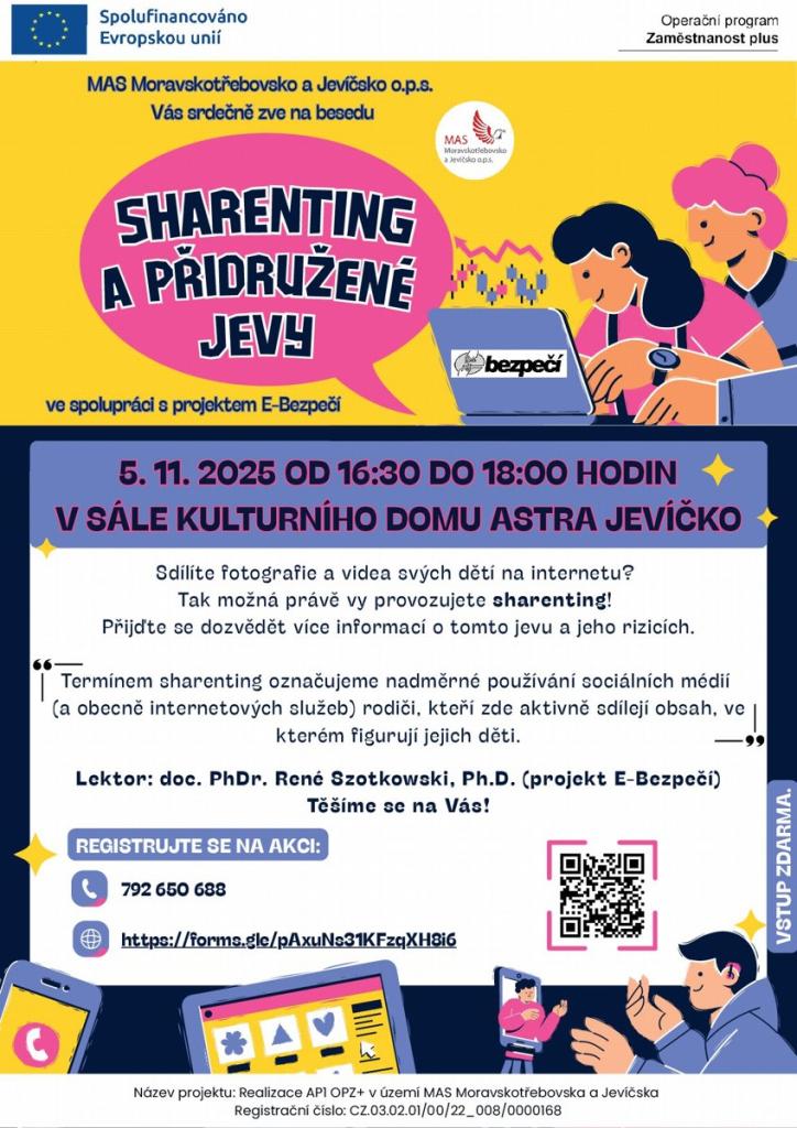 MAS Moravskotřebovsko a Jevíčsko o.p.s. vás zve na besedu zaměřenou na fenomén sharentingu a jeho přidružené jevy. Akce se uskuteční 5. listopadu 2025 od 16:30 do 18:00 v sále KD Astra v Jevíčku. Lektor, doc. PhDr. René Szotkowski, Ph.D., vám přiblíží nejen definici sharentingu, ale také jeho rizika. Dozvíte se, jaké důsledky může mít sdílení fotografií a videí vašich dětí na internetu. Přijďte se informovat a sdílet názory s ostatními účastníky.