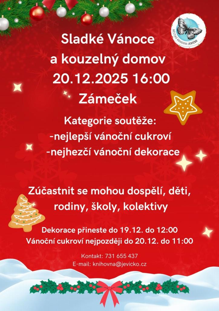 Zveme Vás na soutěž Sladké Vánoce a kouzelný domov, která se koná 20. prosince 2025 v 16:00 na Zámečku. Můžete se přihlásit do kategorií nejlepší vánoční cukroví a nejhezčí vánoční dekorace. Soutěže se mohou zúčastnit dospělí, rodiny, školy a kolektivy. Dekorace je nutné přinést do 19. prosince do 12:00, zatímco vánoční cukroví musí být odevzdáno nejpozději do 20. prosince do 11:00.