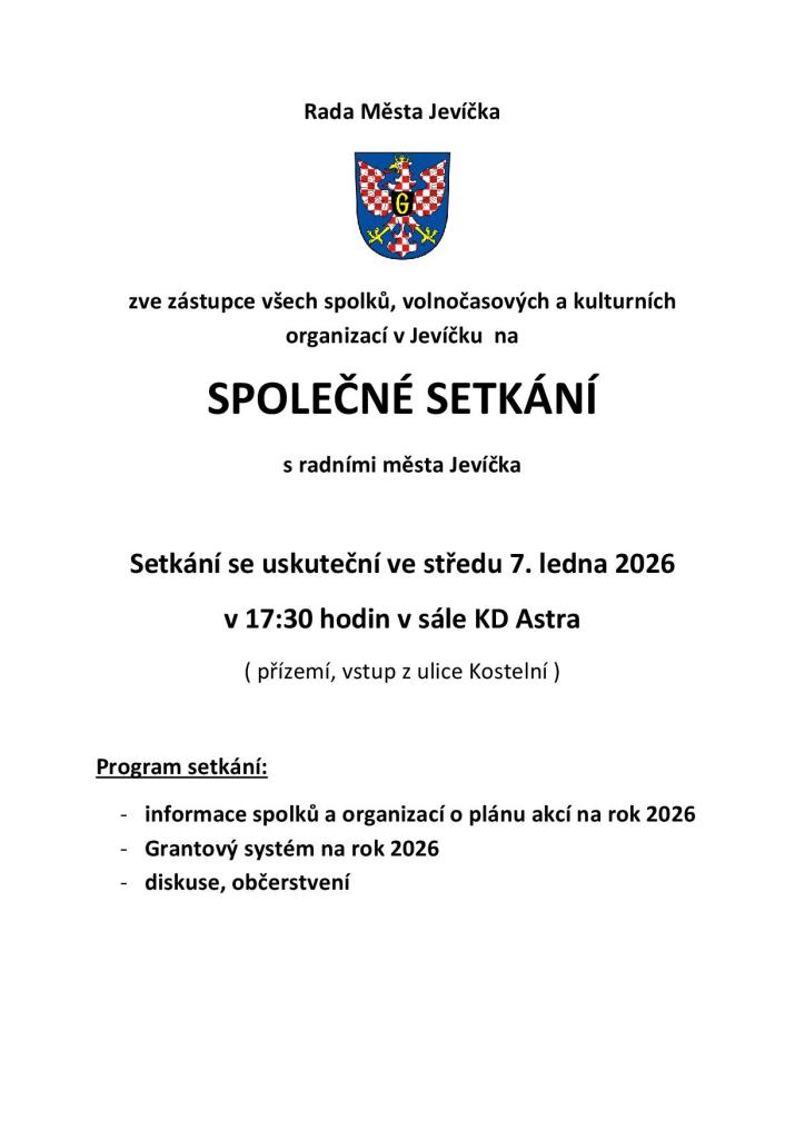Rada Města Jevíčka zve všechny zástupce spolků, volnočasových a kulturních organizací na setkání s radními města. Toto setkání se koná ve středu 7. ledna 2026 od 17:30 v sále KD Astra. Účastníci se dozví informace o plánu akcí na rok 2026 a o grantovém systému. Bude probíhat také diskuse a občerstvení.