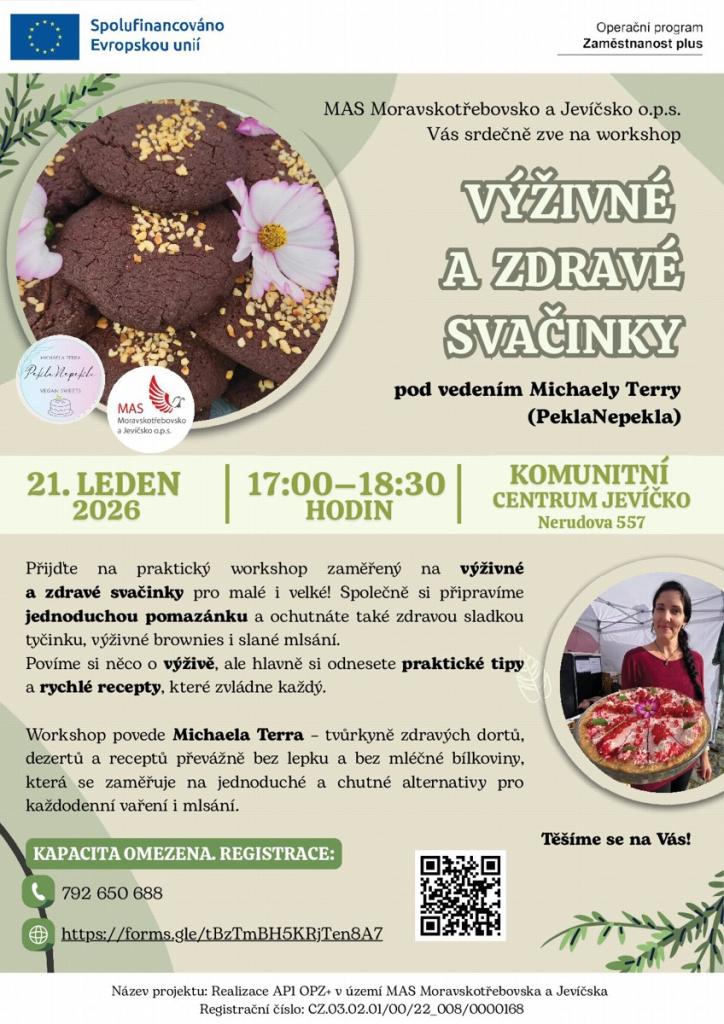 Zveme vás na workshop zaměřený na výživné a zdravé svačinky. Pod vedením Michaely Terry se naučíte připravit jednoduché pomazánky a ochutnat zdravé sladké i slané mlsání. Workshop se koná 21. ledna 2026 od 17:00 do 18:30 v Komunitním centru v Jevíčku. Na workshopu se dozvíte více o výživě a odnesete si praktické tipy a rychlé recepty.