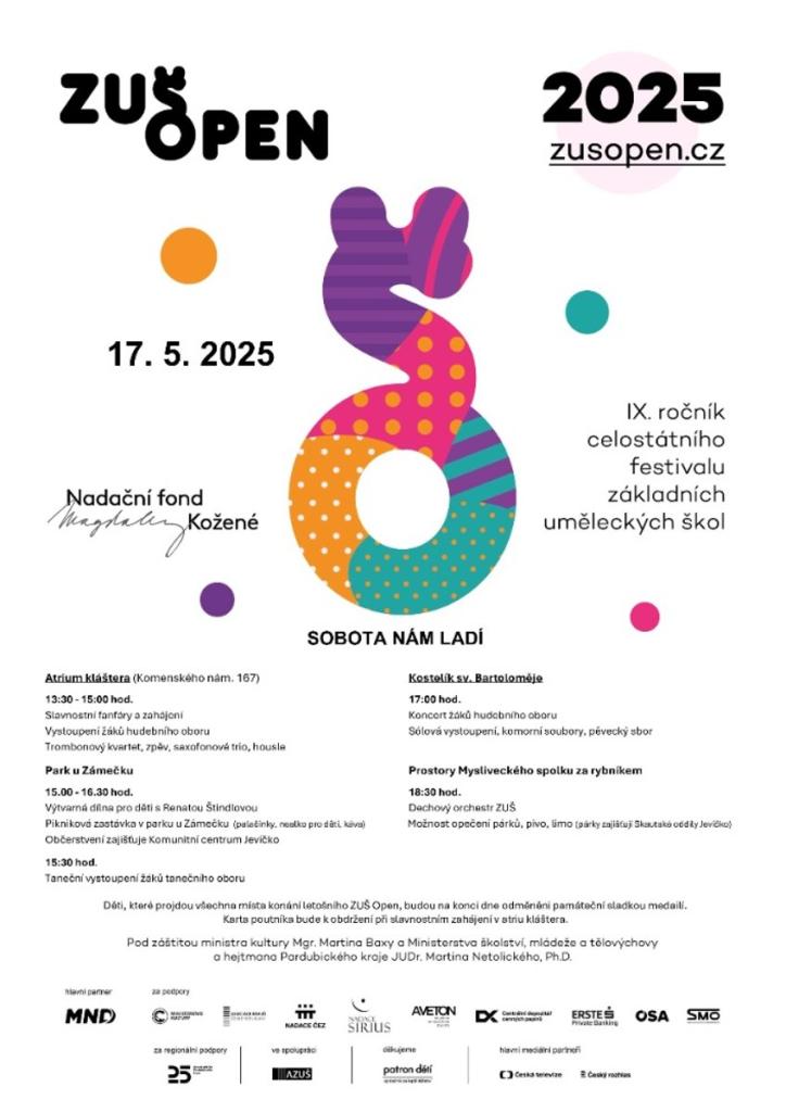 Zveme vás na jedinečnou akci ZUŠ OPEN, která se uskuteční 17. května 2025. IX. ročník festivalu Základních uměleckých škol. Přijďte si užít odpoledne plné umění, hudby a kreativních vystoupení od našich talentovaných studentů. Těšíme se na vaši návštěvu!