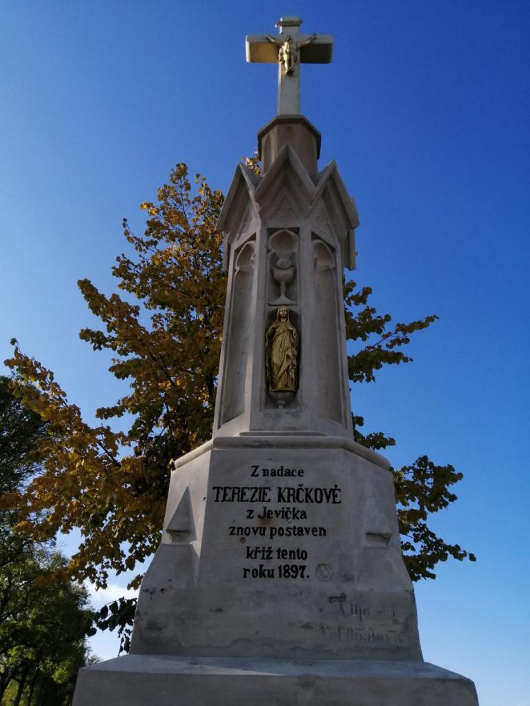Popis: Jedná se o celokamenný kříž u silnice do Zadního Arnoštova a silničky ke kostelíčku sv. Bartoloměje, který byl v minulosti renovován kameníkem Langem z Velkých Opatovic z nadace Terezie Krčkové z Jevíčka. Na kříži je kovová plastika Krista s nápisem, socha Panny Marie v nice chyběla. Povrch kříže byl zvětralý, kovové součásti byly zkorodované, vyskytovaly se statické praskliny. Schodnice kříže byly rozestoupené a značně staticky narušené. Základ byl z toho důvodu nově proveden. V těle kříže byly v minulosti neodborně provedeny vysprávky po poškození při dopravní nehody. V rámci obnovy byly také ve větším rozsahu vyměněny některé krajní komponenty za nové pískovcové doplňky. Realizace kamenosochařství Petr Hemzal.
