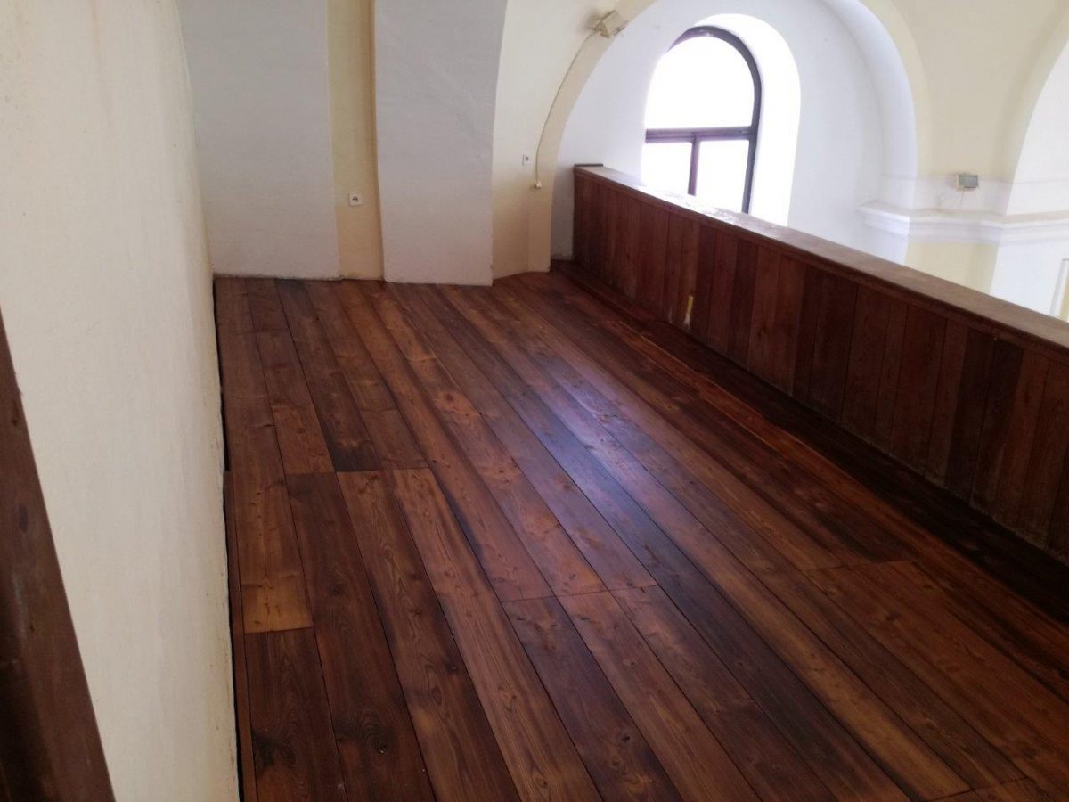 Popis: Stávající dřevěné podlahy byly ve vysoké míře napadeny dřevokazným hmyzem (červotočem), proto byly odstraněny. Položeny byly nové podlahy tvořené dřevěnými polštáři 80/100. Podlahová krytina je z hoblovaných fošen, řezivo modřínové. Nášlapná plocha podlahy je opatřena ochranným olejovým nátěrem. Ostatní dřevěné konstrukce jsou chráněny nátěrem proti dřevokaznému hmyzu, houbám a plísním. Zhotovitel: MOLAT s. r. o. Velké Opatovice.